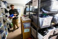Cory Butler organizes donated clothes inside Rod's House closet in Yakima, Wash. on Friday, Jan. 12, 2018. Butler helps out at Rod's House, a drop-in site for homeless youths, whenever he can. (JAKE PARRISH/Yakima Herald-Republic)